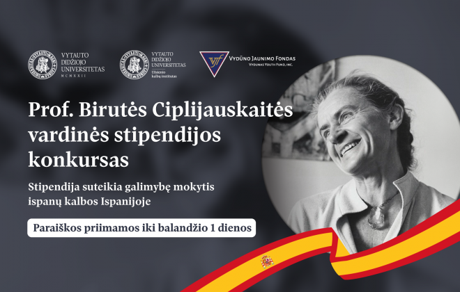Vytauto Didžiojo universiteto Užsienio kalbų institutas skelbia prof. Birutės Ciplijauskaitės vardinės stipendijos konkursą. Ši stipendija kasmet skiriama vienam VDU studentui, sėkmingai besimokančiam ispanų kalbos VDU. Taip pat kandidatas turėtų mokytis ne paskutiniame kurse, pasižymėti darbštumu, būti pasiekęs puikių akademinių rezultatų, aktyviai dalyvauti studentų visuomeninėje ir…