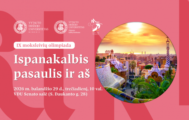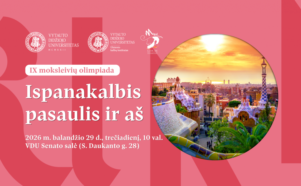 Balandžio 29 dieną, trečiadienį, Vytauto Didžiojo universiteto Senato salėje (S. Daukanto g. 25) vyks IX-oji moksleivių olimpiada „Ispanakalbis pasaulis ir aš“ (isp. El mundo hispanohablante y yo). Dalyvauti olimpiadoje kviečiami 6-8 ir 9-12 klasių moksleiviai, kurie savo mokyklose lanko ispanų kalbos ir/ar kultūros užsiėmimus. Daugiau informacijos pateikiama olimpiados…