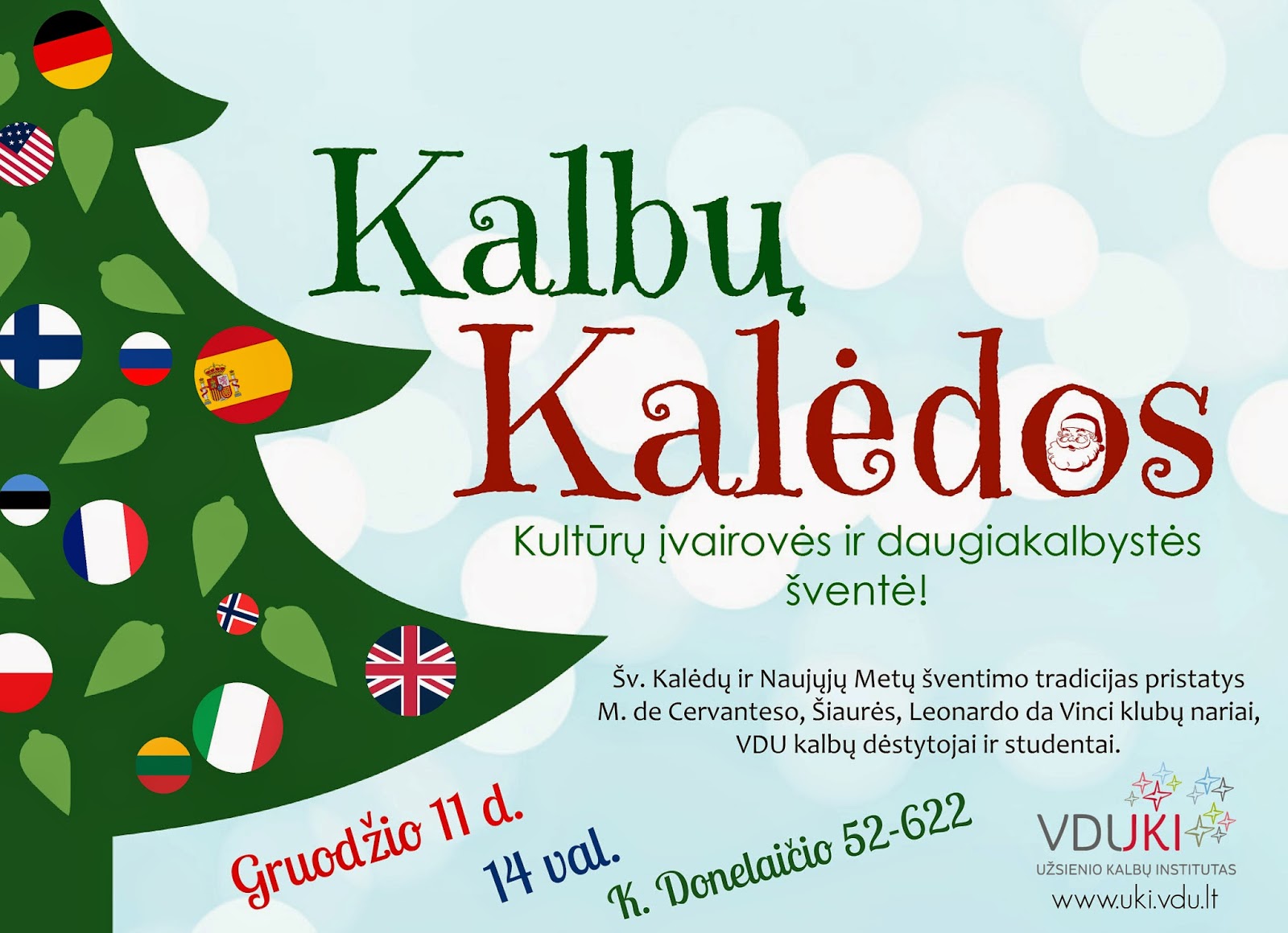 Rytoj, gruodžio 11-ąją, 14 valandą, VDU III-iuose rūmuose (K. Donelaičio g. 52-622) VDU Užsienio kalbų institutas kviečia švęsti „Kalbų Kalėdas“. Renginio metu bus pristatytos įvairių šalių Šv. Kalėdų ir Naujųjų Metų šventimo tradicijos, taip pat bus galima išmokti Kalėdinių frazių ir dainų skirtingomis kalbomis.